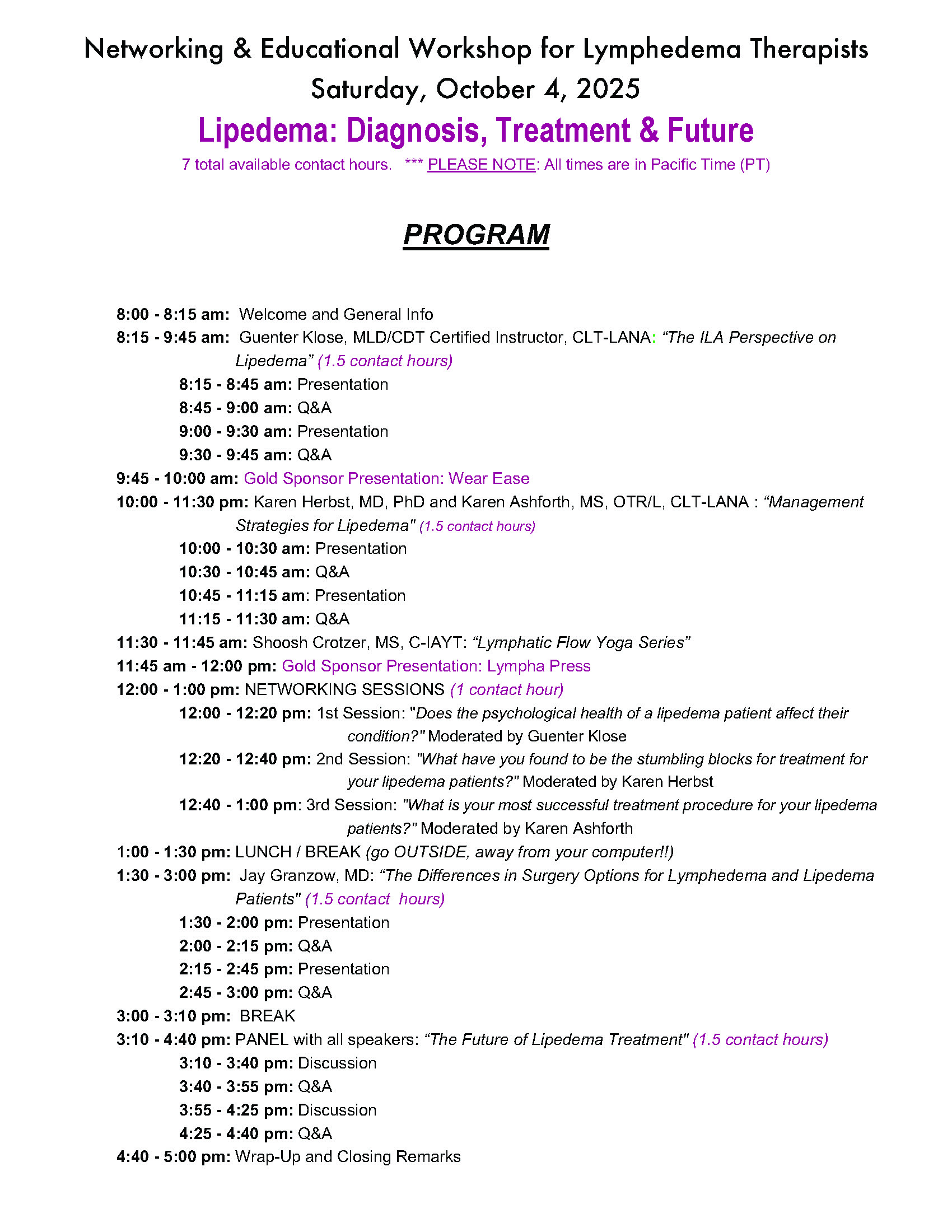 WORKSHOP CONTACT: Shoosh Crotzer, Lymphedema Seminars, 805.772.3560